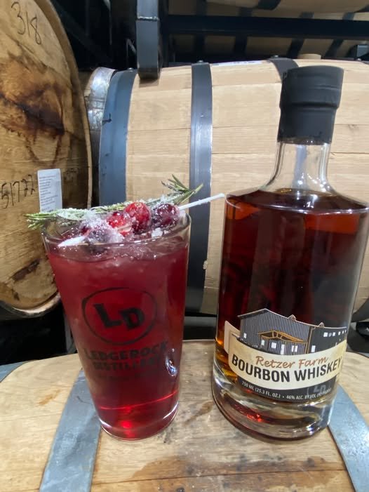 In a glass of ice mix Ledgerock Bourbon and simple syrup. Top with cranberry juice. Mix. Moisten the cranberries and rosemary sprigs with water and roll in sugar. Garnish. Enjoy!