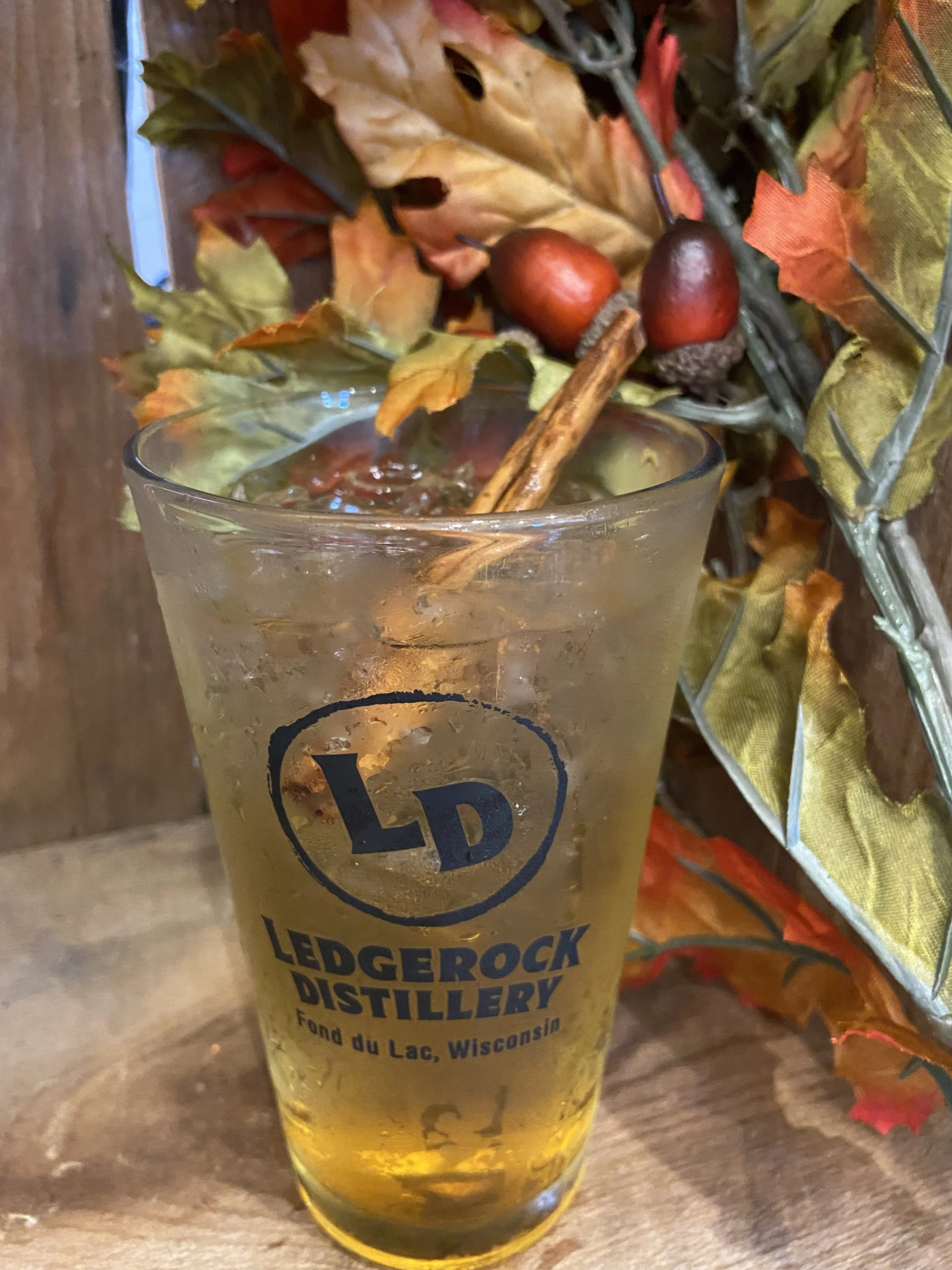 In a glass of ice add Ledgerock Bourbon, maple syrup and bitters. Top with spiced apple cider. Mix. Enjoy!