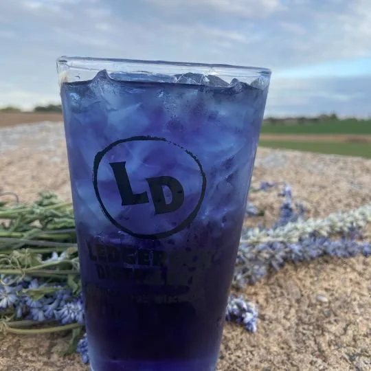 In a glass of ice add Ledgerock Gin, Blue Curacao, and Jolly Good grape soda. Top with white soda. Mix. Enjoy!