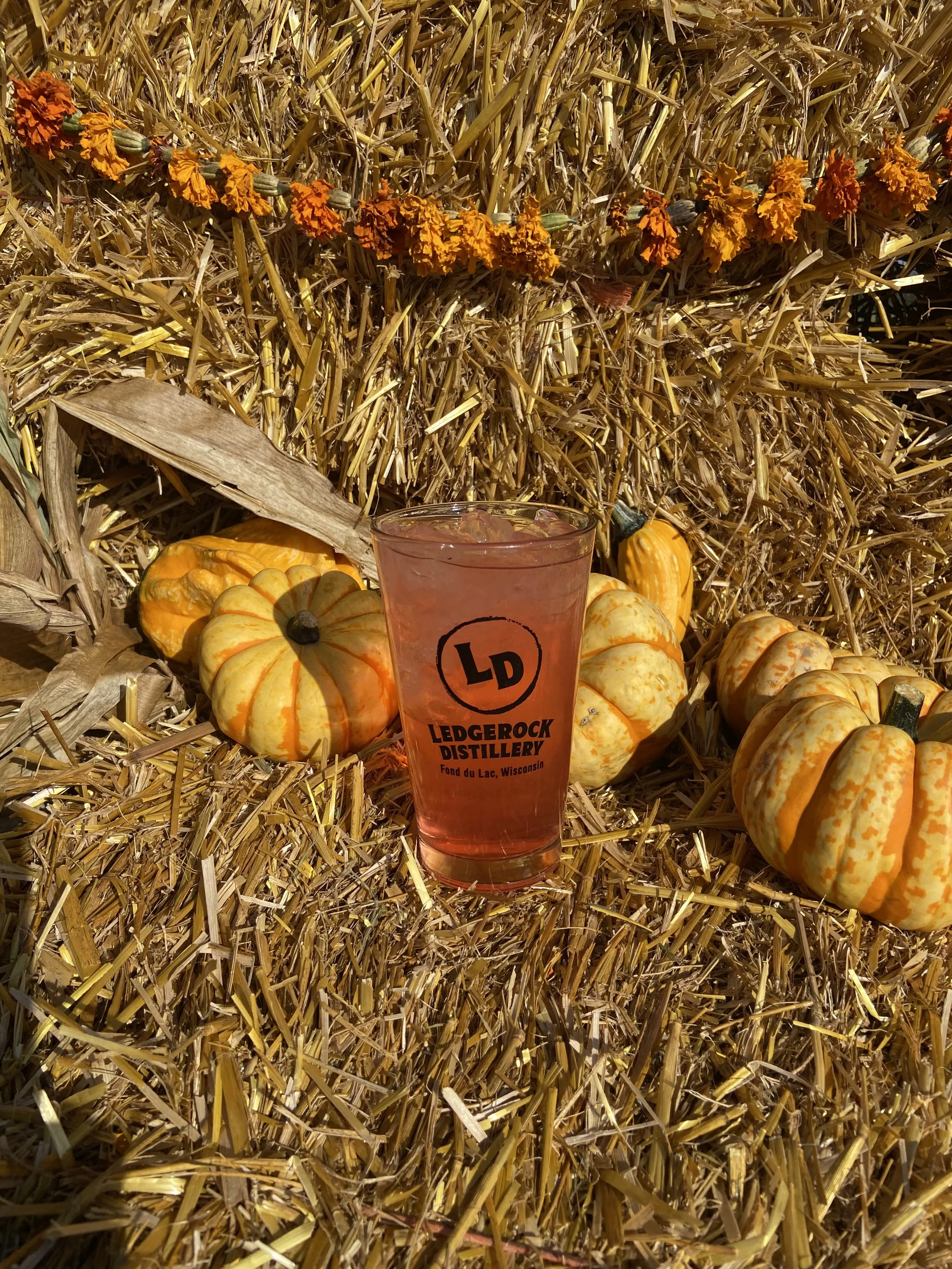 In a glass of ice add Ledgerock Vodka, lime juice, pumpkin puree, Triple Sec, and shakes of pumpkin spice. Top with ginger beer. Mix. Enjoy!!