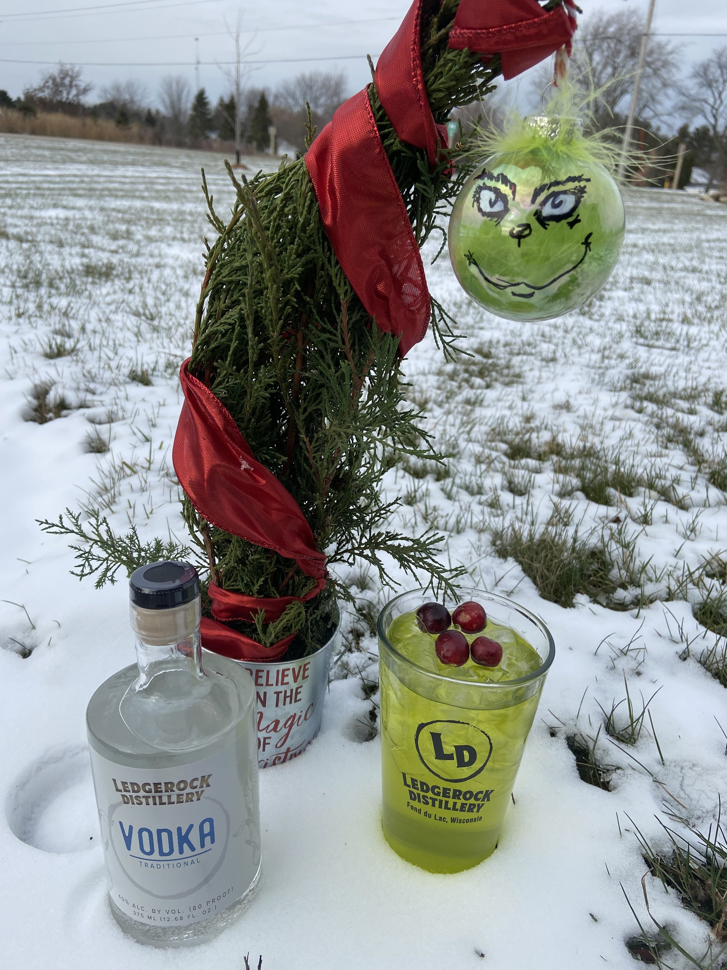 In a glass prepped with corn syrup and Christmas sprinkles add Ledgerock Vodka, cranberry juice, red grapefruit juice, orange juice, and Triple Sec. Mix. Enjoy!